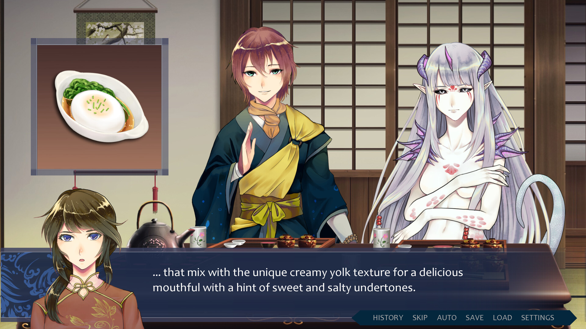 Perhaps it might help to put more explicit emphasis on their banter during their meals and how the food or the meal is being related to in the scene? Or maybe it could be a player choice to ask about the foods prepared, like during the picnic where Jinhai explains what all the foods were. Sorry for rambling on and on just thought I'll throw in my 2 cents!!)